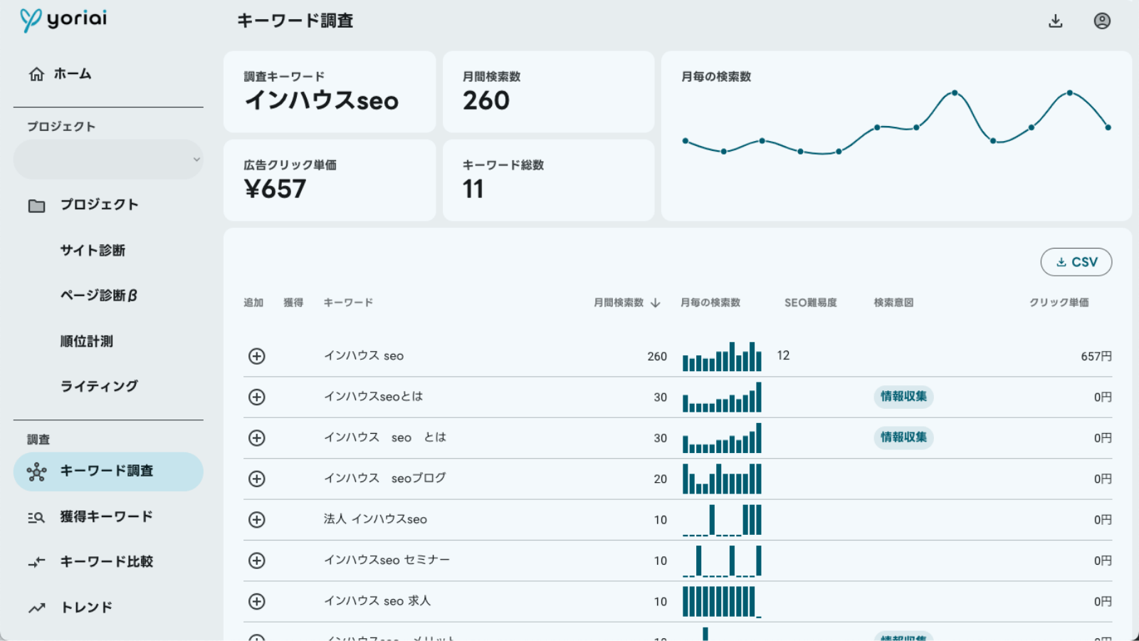 インハウスSEOは、実務経験豊富なSEOディレクターの知見をもとに開発された、シンプルで実用的なSEO支援ツールです。 調査・分析・改善提案・コンテンツ作成など、SEO対策に"本当に必要な機能だけ"を厳選し、誰でも効率的に活用できる設計となっています。